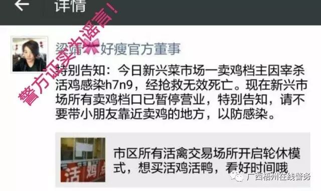 昨日(3月11日)起,梧州本地朋友圈及各QQ群流传了这样一则“消息”,称“新兴菜市一卖鸡档主宰杀活鸡感染H7N9经抢救无效死亡”“现新兴市场所有卖鸡档口已暂停营业”。