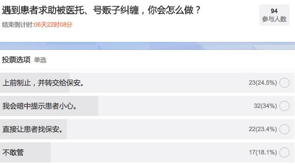 在丁香园微博发起的「遇到患者求助被医托、号贩子纠缠,你会怎么做?」投票中,有不到 20% 的网友选择不敢管,只有四分之一不到的网友会直接上前制止,这也侧面证明了,大家想管却有顾虑。