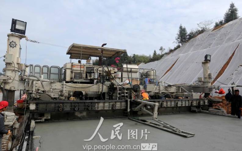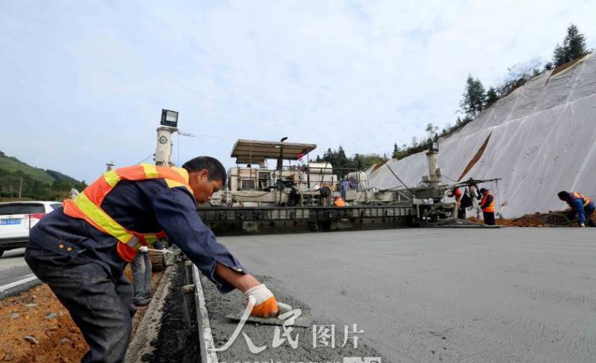 11月11日,在三柳高速施工工地,工人们在进行路面混凝土铺设作业。