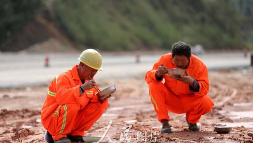 11月11日,两名中交三公局筑路工人在三柳高速施工工地吃午饭。