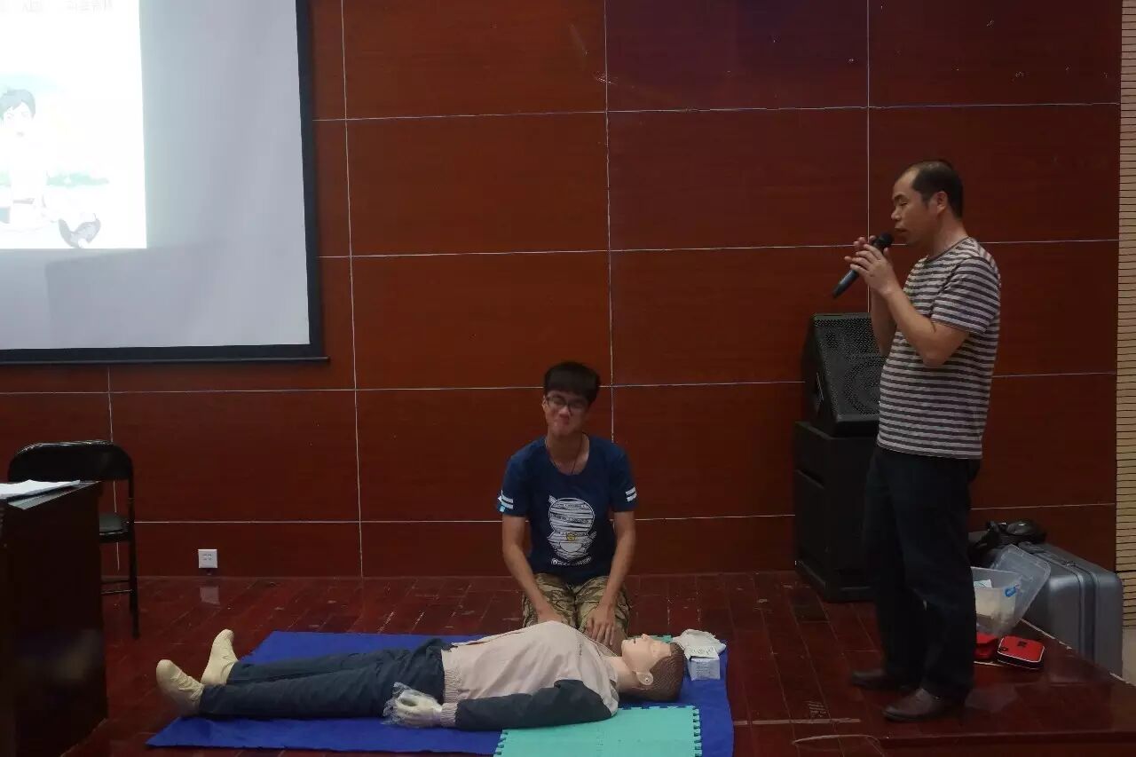 马老师邀请志愿者上台互动,展示心肺复苏法