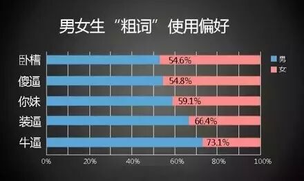 百度输入法大数据显示,人们最常使用的“粗词”中,男生还是爆粗口当之无愧的“主力军”,所有词语的使用都是男生多于女生。其中“牛逼”使用的差异最明显,男生使用的频率是女生的近3倍。