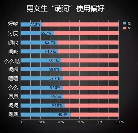 虽说女生有时会爆粗口,但大多数时候还是很萌很可爱的。数据显示,和男生相比“好哒”是女生最爱的词,其使用的频率是男生的3倍以上。“讨厌”位列第二,再往后的“嗯呢”、“嗯哪”、女生使用的比例都超过了60%。而男生也有卖萌的时候,“嘿嘿”就是男生更偏爱的词,其使用的比例略高于女生。