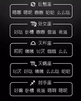 此外,大数据显示的星座偏好中,十二星座偏爱的词也确实不太一样:双鱼、白羊、处女、射手、摩羯的脾气似乎不小,他们偏爱的前五个词里有两个甚至更多的“粗词”。而水瓶、金牛、狮子、巨蟹、天秤、天蝎则显得萌萌哒。