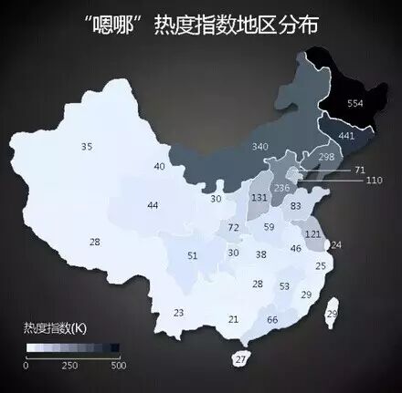 “嗯呢”、“嗯哪”可谓最著名的东北方言,网聊时也不例外:东北银最爱用,临近东北的省份也多少受到些熏陶。其中黑龙江“嗯哪”的使用频率最高,其热度指数高达553606,是同为东三省辽宁的近两倍,是天津的5倍以上。而在中国的其他地区“嗯哪”的热度则普遍不足五万,热度最低的广西省其热度不到黑龙江的1/25。