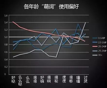 数据还显示,20-24岁是“最爱卖萌的年纪”,几乎所有测“萌词”使用频率都高于平均水平(平均水平为1),其中“好哒”的使用频率是平均水平的1.4倍以上,而其他年龄则都在平均水平以下。