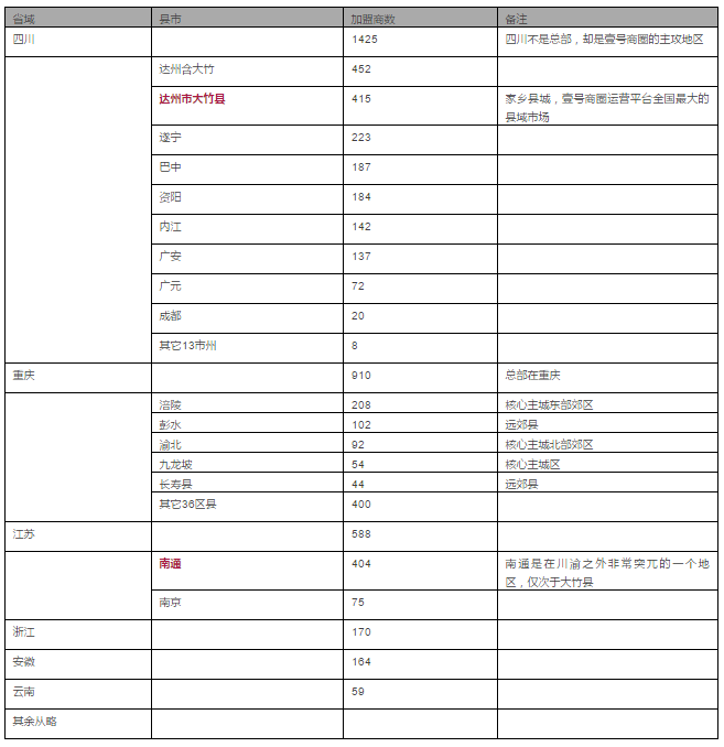 从以上数据可以看出,壹号商圈的扩张模式,按照典型的农村包围城市、集中优势兵力在偏远地区建立根据地的模式展开,即便在重庆这个总部地区,也是在主城之外取得最大的突破,包括前文的天添薪、从山东莱芜搬到黑龙江绥化的趣购商城,都是一样的打法。