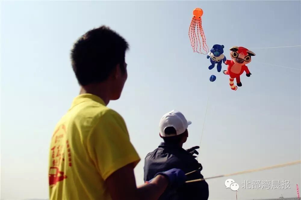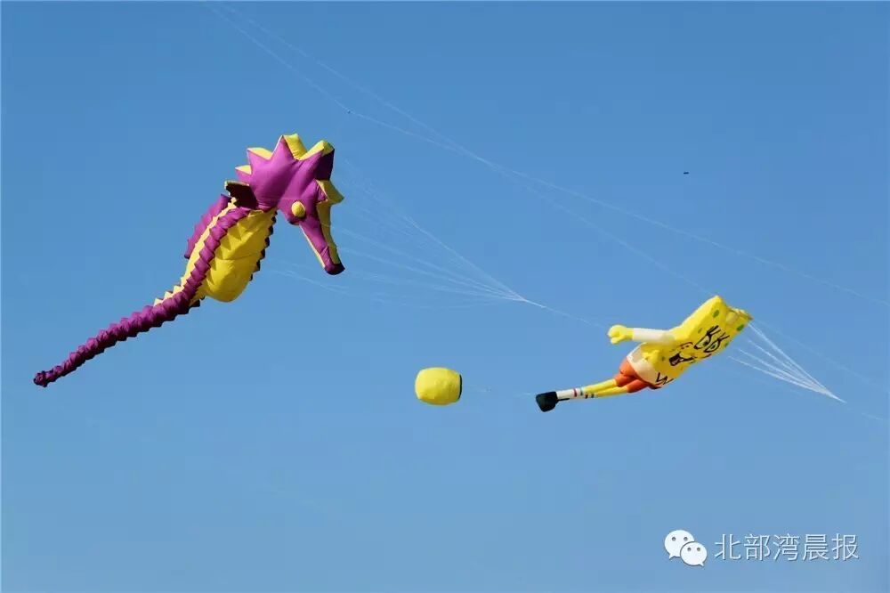 12月2日,记者在茅尾海黄金海岸海滨浴场看到,湛蓝的天空上,形状各异、五颜六色的大型风筝在风中飞舞,成为钦州海滩上一道靓丽的风景线。大型风筝放飞表演活动给市民带来了一场别开生面、多姿多彩的风筝盛会。