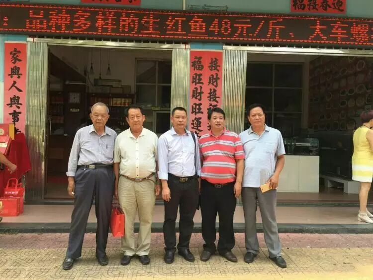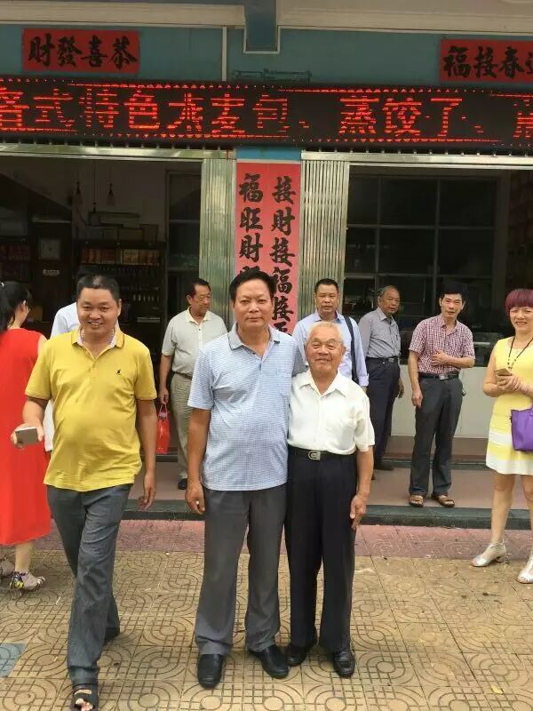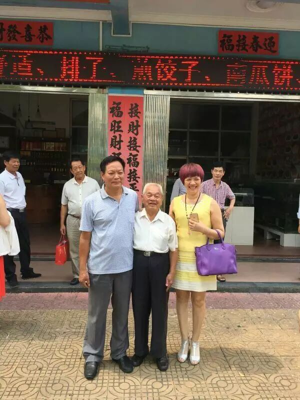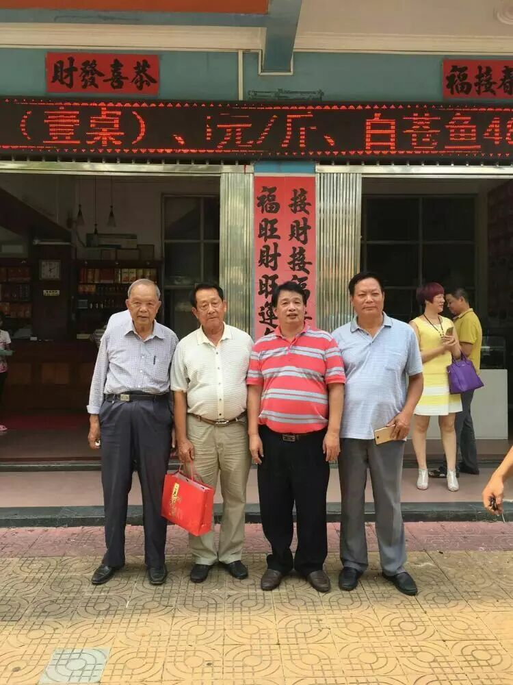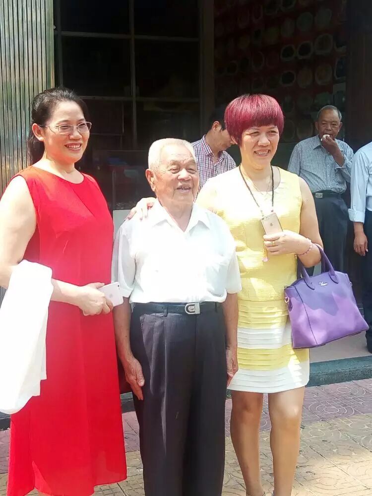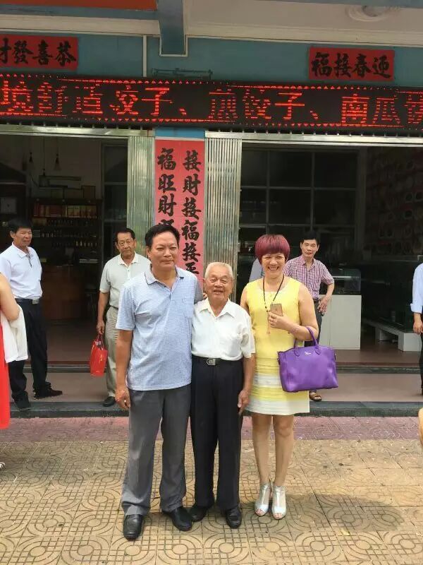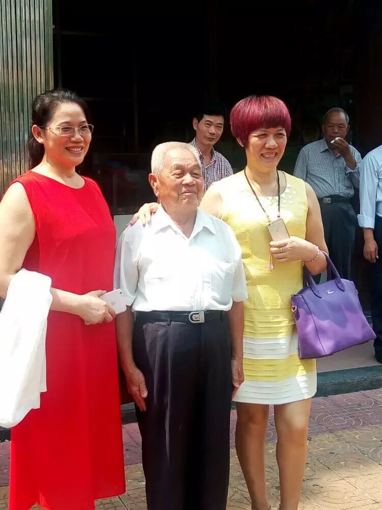 北海邓氏海产品有有限公司董事长邓凤与姐姐邓燕与九十岁名誉会长邓天冒合影