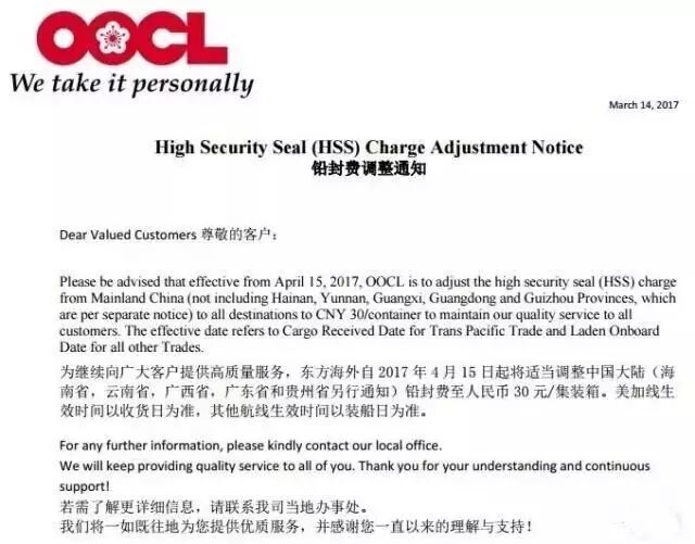 找船网资讯:近日,OOCL(东方海外)正式发布通知,4月15日起将适当调整中国大陆(海南省,云南省,广西省,广东省和贵州省另行通知)铅封费至人民币30元/集装箱。美加线生效时间以收货日为准,其他航线生效时间以装船日为准。请广大的外贸企业和货代企业注意,以下为OOCL正式通知文件: