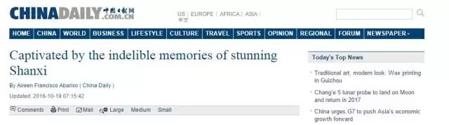 厉害了word外教!Aireen外教9月末参加了中国日报举办的"Shanxi in theeyes of international friends Trip"(洋眼看山西—大型境外旅游宣传推广活动) 可谓收获颇丰啊~据Aireen本人说中国的每一寸土地都很amazing~中国朋友的热情和友好深深打动了她!下面我们一起来看看她在中国日报上刊登的文章吧! 链接戳这里↓↓↓↓↓↓↓↓↓http://www.chinadaily.com.cn/cndy/2016-10/19/content_27102556.htm 正文如下~My experience of Shanxi province was so wonderful and profound that scarcely a day has goneby since I left that I haven't relived the experience in my mind.The amazing beauty of the place captivated my senses and I can still perfectly recall everyscenic spot we visited on the trip.Unsurprisingly, the modern world has resulted in a great many changes, and seeing such a placeand the treasures it contains allowed me to reflect on the beauty of the past and hope that theyounger generation could one day come and appreciate the magnificent temples and incrediblewall paintings.The approach to the Hanging Temple in the county of Hunyuan, with the massive mountainssurrounding the beautiful sanctuary mounted high on the mountain, was simply awe-inspiring andI felt my heart beating faster and faster as we drew near.It was incredible to watch people climbing ever-upwards to get a close-up view of the temple, andthis is something else that will live long in my memory. As I was climbing, I was enveloped by a feeling of tranquility and felt that I was communing withnature.Reaching the top was no easy feat, and when I eventually did, I felt as though I was standing ontop of the world. I felt a complete sense of freedom and serenity I had rarely, if ever, experiencedbefore. There is no feeling quite like it.The visit to the temple also made me realize that we should remember and respect the customsand beliefs of those that came before us. I also learned a lot about the religious beliefs andpractices of those that lived and worshipped at the temple, such as their intricate hand gestures.The people that accompanied me on the trip were as amazing as the scenery we encountered,and all of us marveled at how Chinese culture is so steeped in history. It is crucial that thishistory, in the form of buildings, art works and natural wonders, is protected and preserved forfuture generations.It is amazing to me how China is able to combine the past with the present through the protectionand presentation of its stunning cultural wonders. Somehow, Shanxi's sense of past, present andfuture conveyed the fact that, as well as its glorious past, China is also very much a modernmarvel.The Chinese people were wonderful hosts, too, and we were made to feel incredibly welcomewherever we went.I was also extremely impressed by the art of paper-cutting, which required painstaking precision,passion, creativity and, most of all, patience. Never before had I seen such qualities distilled intoone art form and I wish I had the same skill and patience as the practitioners we were luckyenough to witness. In addition, Shanxi possesses a wonderful variety of food and we were presented with uniquedishes wherever we stopped to eat.The sheer variety of what was on offer made me appreciate how a place's food culture can helpone appreciate and understand both the place and its people.The trip was more than just a travel experience; it provided a lifetime connection to the people,places and culture in an extraordinary province and country. I consider myself fortunate that I hadthe chance to experience Chinese culture at first hand and meet so many extraordinary people.The author, from the Philippines, is a professor at Guangxi Normal University and a member of"Shanxi in the eyes of international friends". GXNUCICE广西师大国教院新媒体中心图、文/ Aireen