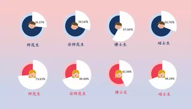 2016 届毕业生中,男女比例总体上依然是三比七。其中,男生 2317 人,占 30.34%;女生 5319 人, 占 69.66%。 除了博士生是男生人数多于女生, 本科生、 硕士生的男女比例分布基本都是呈三七开。