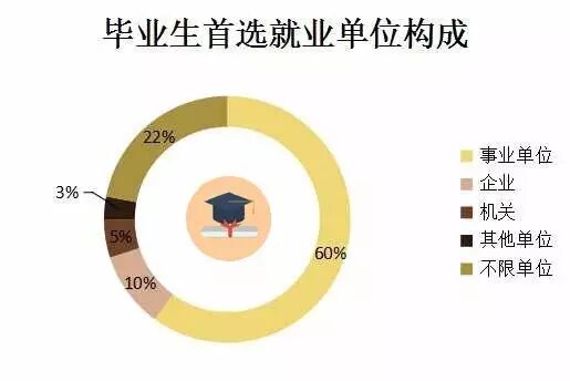 近 60%的毕业生将事业单位作为首选就业单位, 5%的毕业生将机关作为首选就业单位,还有22%的毕业生求职初期暂没有明确的单位意向。