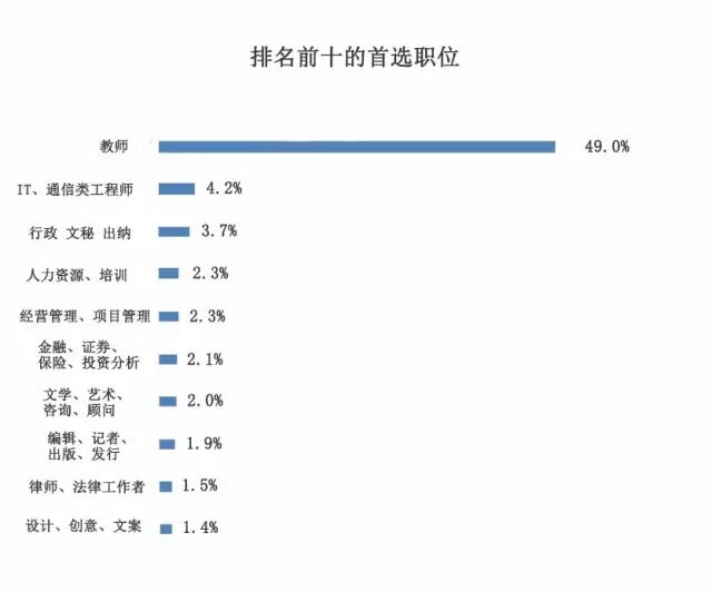 从首选职位排名情况来看, 我校接近50%的毕业生的首选职位为教师,符合师范院校特征。还有50%的毕业生对职位的选择主要集中在工程技术人员、 文学艺术工作人员、 、 文化工作人员等各类专业技术人员以及行政办公人员等方面。