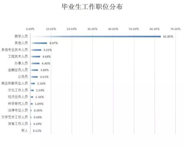 2016 届毕业生工作职位的实际分布与意向职位构成基本一致。 其中, 62.85%为“ 教学人员”,“ 其他人员” 、“ 其他专业技术人员” 、“ 工程技术人员” 、“ 金融业务人员” 、 “ 办事人员和有关人员” 的所占比例也较高。
