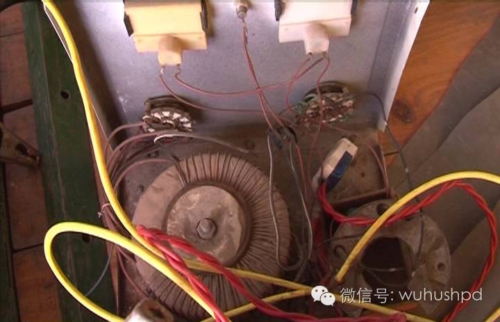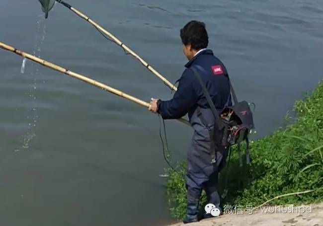只见一名男子,手持两根很长的竹竿,撑起电网,在背上,则是一组电瓶和逆变器。很明显,这是在电捕鱼!