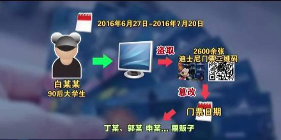 据初步统计,从6月27日至7月20日短短不到一个月的时间,白某某盗取迪士尼乐园门票二维码票号2600余张,篡改日期后贩卖给他人共计1700余张,获得赃款49万余元,而他的行为,造成上海迪士尼乐园损失87万余元。