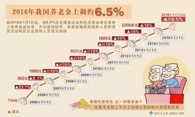 人社部和财政部印发《关于2016年调整退休人员基本养老金的通知》,决定从今年1月1日开始,提高退休人员基本养老金水平6.5个百分点。