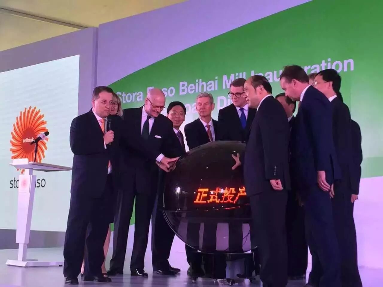(图为与会的国内外政要及斯道拉恩索集团高层聚集北海铁山港,一起按下水晶球,共同见证项目正式投产的时刻)