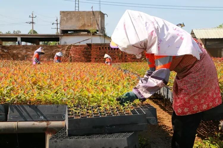 (图为:在山口育苗基地,工人根据技术员的指导,小心地侍弄桉树种苗)