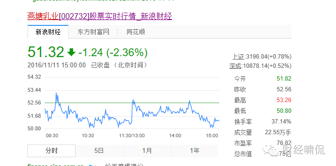11月9日,燕塘乳业股价突破50元大关;截止上周五即11月11日,虽然有所回落,但依然维持在50元/股以上。