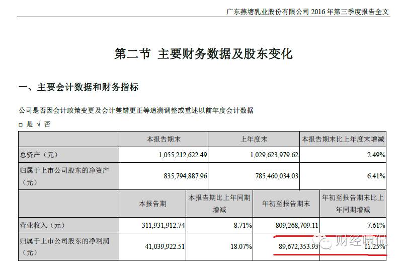 同时,燕塘乳业方面在2016年第三季报中透露,预计2016年全年归属于上市公司股东的净利润约为9605.77万-1.25亿元,涨幅最高可达30%。