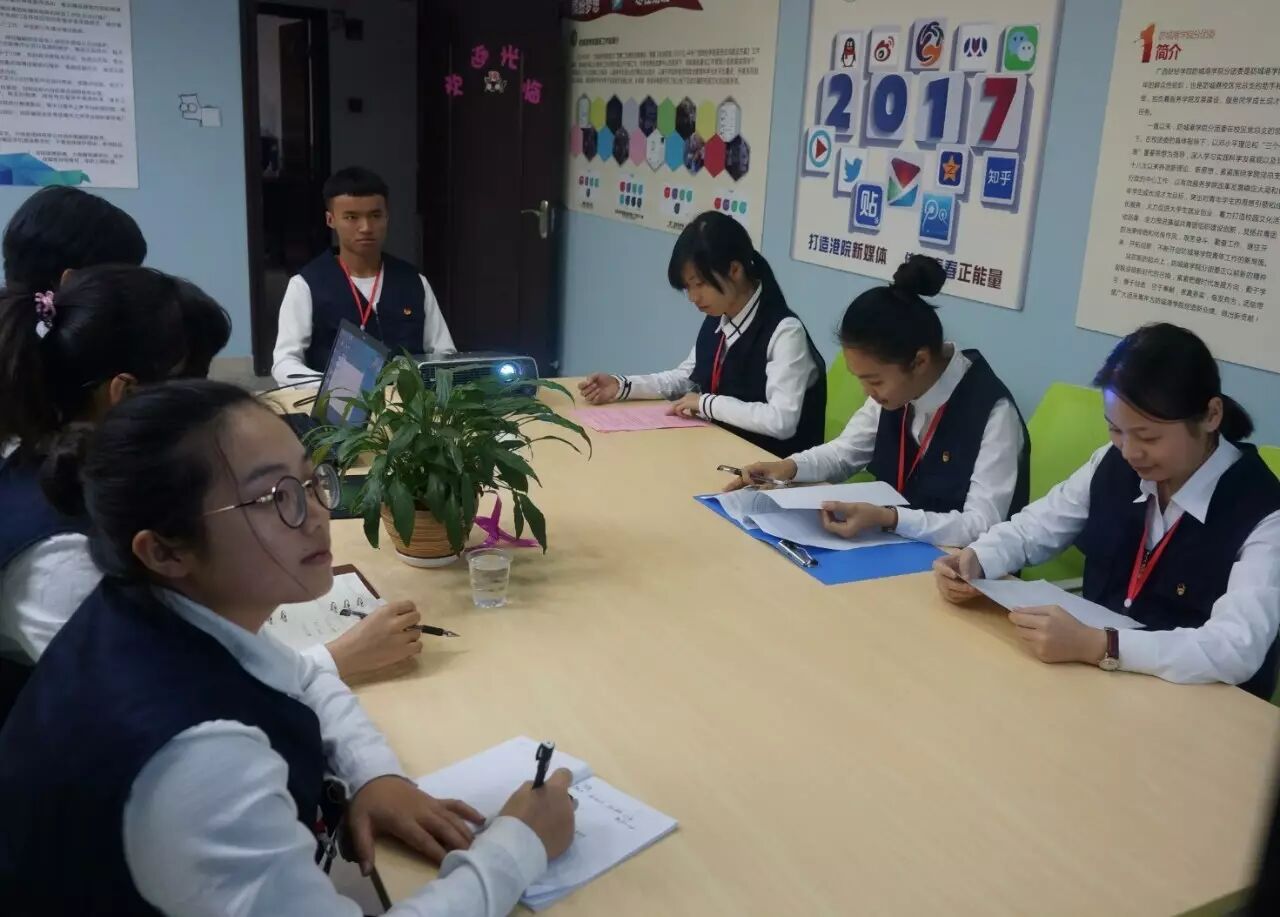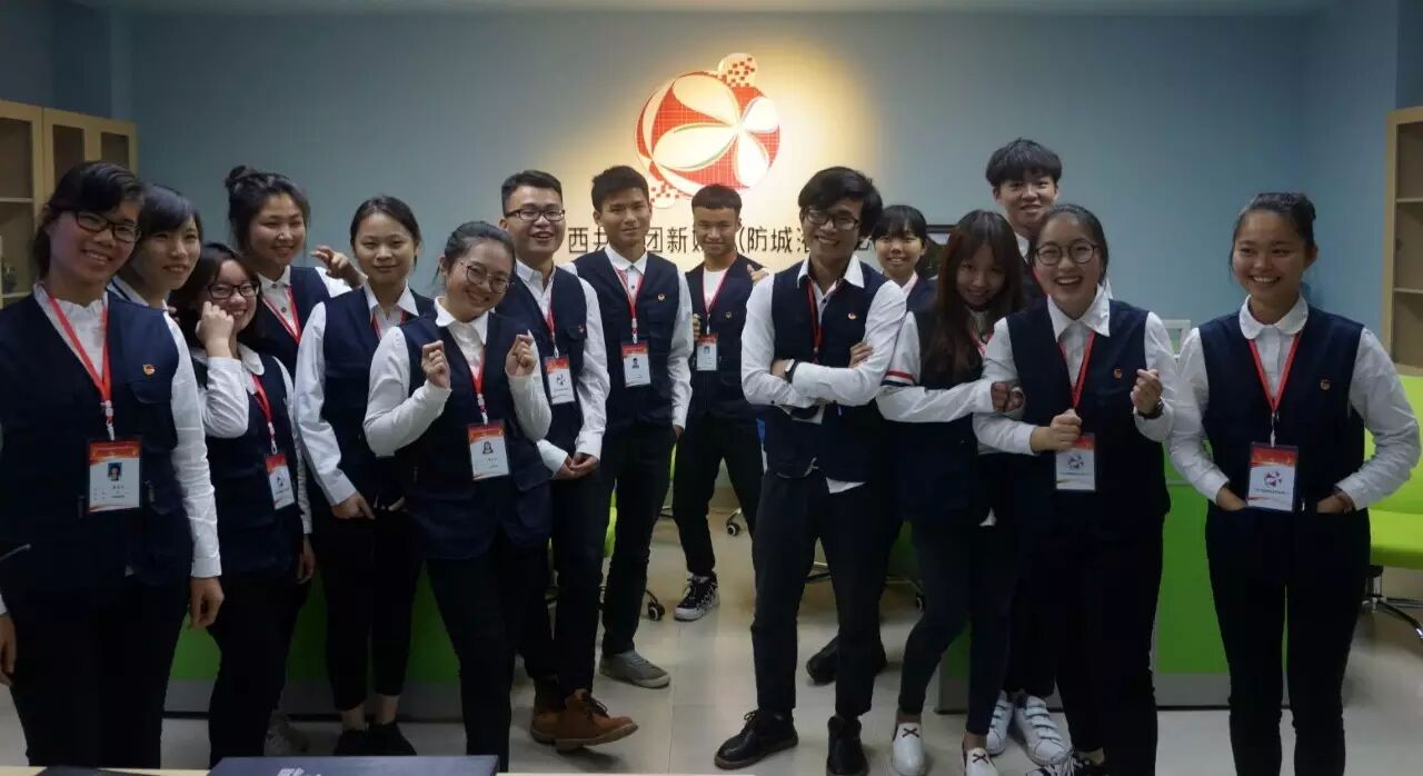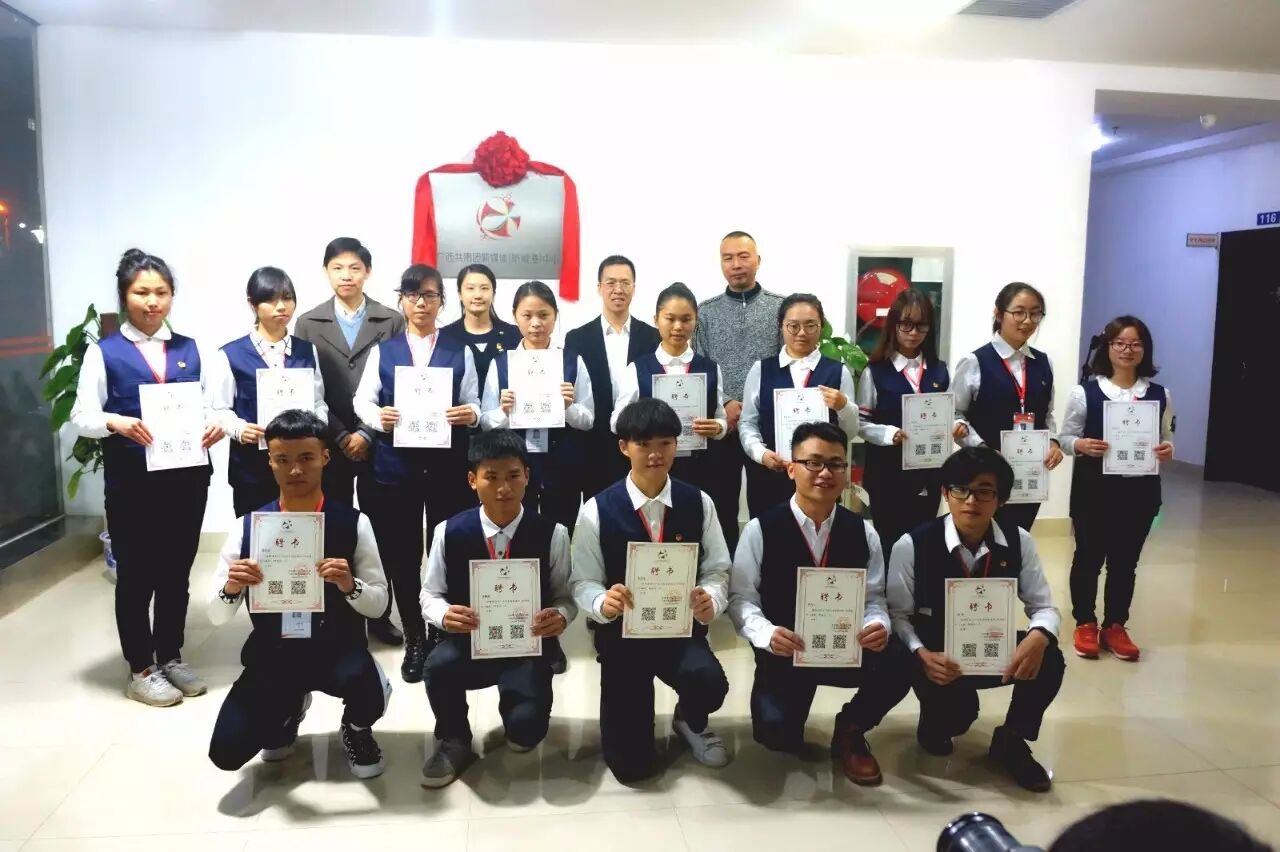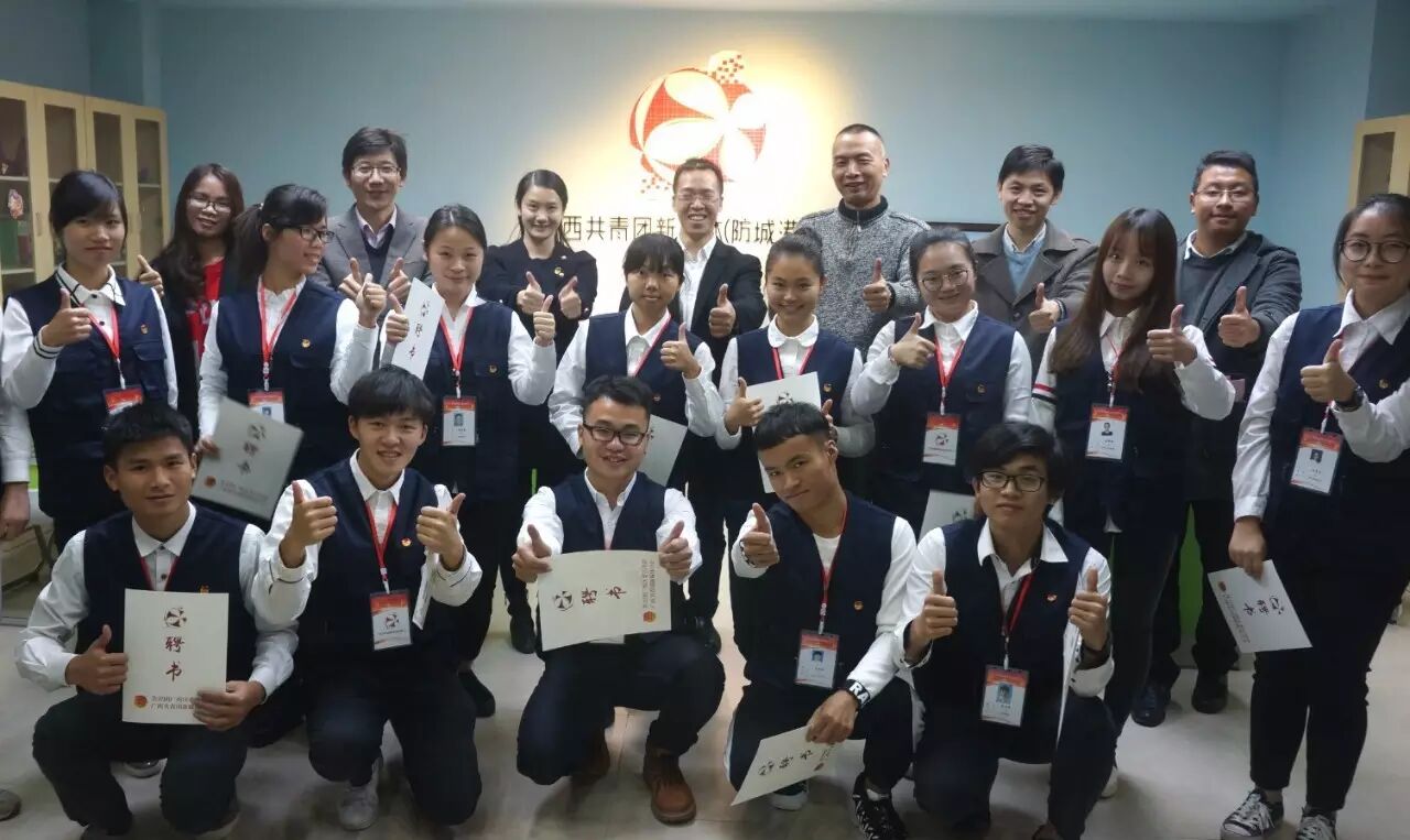 由团区委刘玄启副书记、团区委宣传部谢建伟部长、广西财经学院防城港学院党总支严民富书记、团市委罗敏副书记共同为广西新媒体(防城港)中心揭牌,并为新媒体中心小编发放聘书。