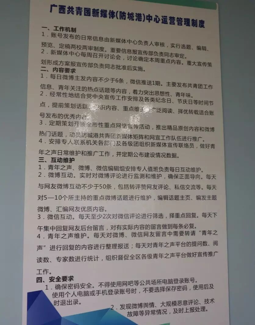 广西新媒体(防城港)中心,是广西依托地市和高校联合成立的新媒体中心之一,是广西区委整合微信、微博、广西青年之声、广西网等新媒体平台,广西新媒体(防城港)中心由团防城港市委、广西财经学院防城港学院指导,设主任部、青年之声部、团微运营部、技术部等4个部门,每个部门设部长1名,目前成员共有16人。