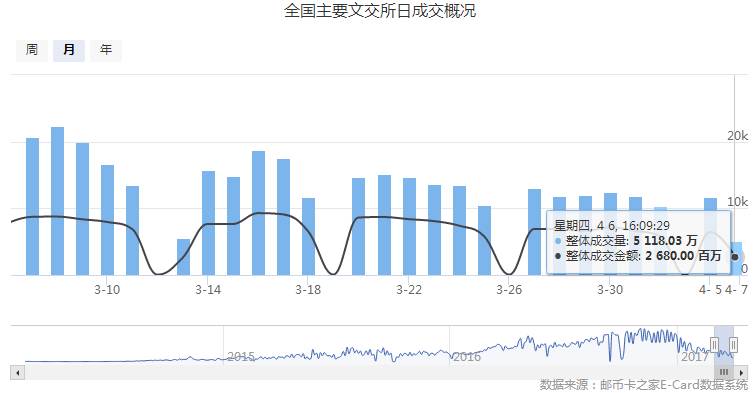 根据邮币卡之家E-card数据系统的统计数据显示,今日邮币卡电子盘白盘总成交量为5118.03万,整体成交金额为2680.00百万。与上一个交易日相比,成交量与成交金额均有明显下降。