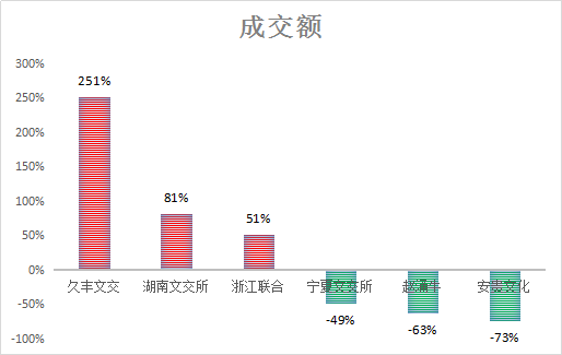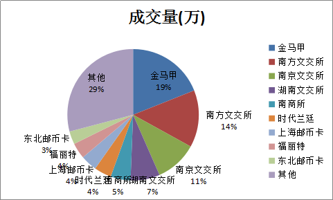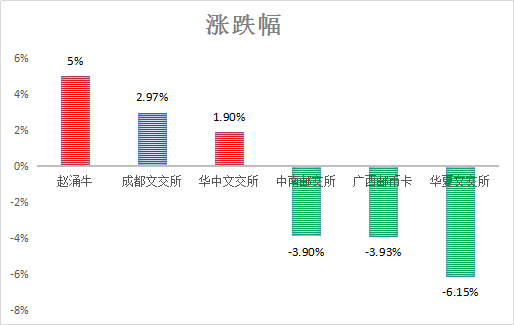 从交易所详情来看,在邮币卡之家E-card数据系统收录的37家文交所中,综指上涨的有11家,下跌26家。其中,赵涌牛上涨5%,占据涨幅榜第一位,华夏文交所下跌6.15%,跌幅最大。