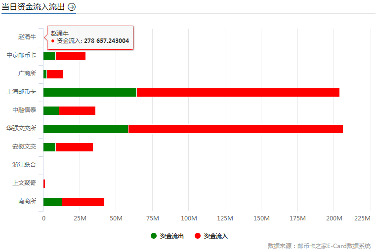 从资金流向来看,华强文交所资金流入1.48亿元,流出0.58亿,净额0.89亿,排名第一。上海邮币卡净额为0.75亿,南昌文交所净额0.65亿,分列二三位。,政策的亮剑高高悬挂在上,各大交易所为了趋于政策都在纷纷转型求生存,目前邮市投资环境不容乐观,邮市资金也在逐步递减。