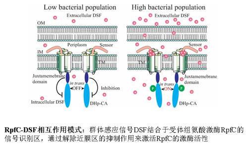 已知细菌的分子“语言”包括高丝氨酸内酯、小肽、喹喏酮等,其中,一类被称为“扩散调控因子(DSF)”的化合物是黄单胞菌、假单胞菌、嗜麦芽窄食单胞菌和博克氏菌等多种动、植病原细菌进行细胞间通讯的信号物质。