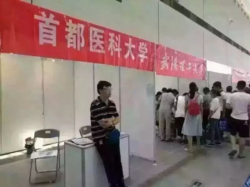照片刚传出时的消息是:2016年的高考咨询会上,首都医科大学的横幅下面站着一位戴着眼镜的中年男性,脸上一副无奈的表情;与此场景相衬的是,武汉理工大学的现场门庭若市,好不热闹。