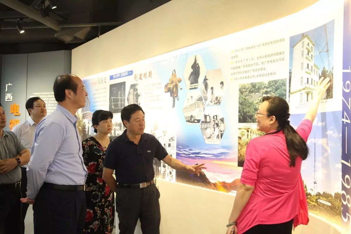 △自治区副主席黄伟京等领导一行参观广西广播影视博物馆,了解广西电视发展历程。