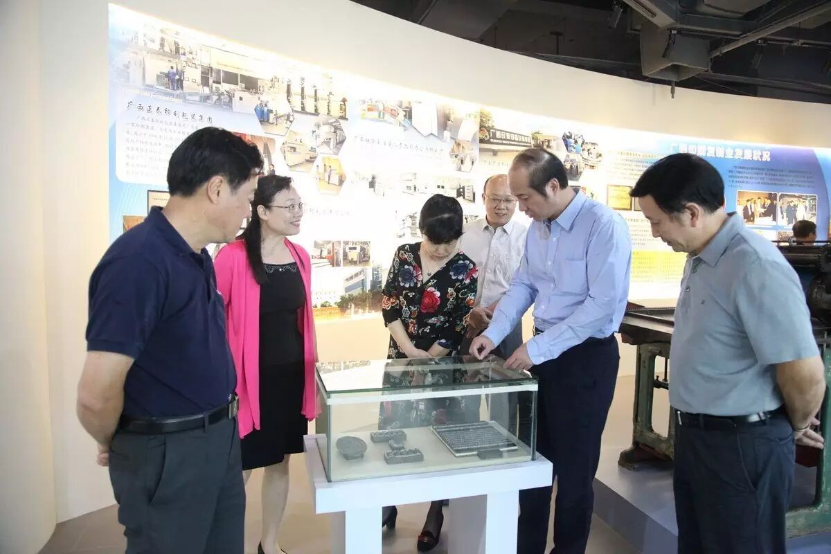 △黄伟京副主席等领导一行在了解广西广播影视博物馆内的印刷设备。
