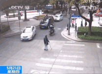 ▲上海一路口,一位拄拐老人正在斑马线上,一辆银色轿车正在左转,虽然当时银色轿车的车速不快,但驾驶员并没有做出停车让行的动作,把老人撞倒在地。