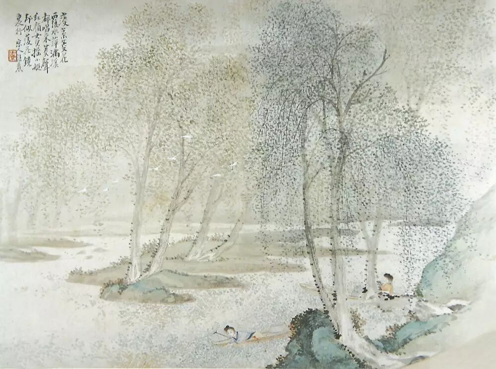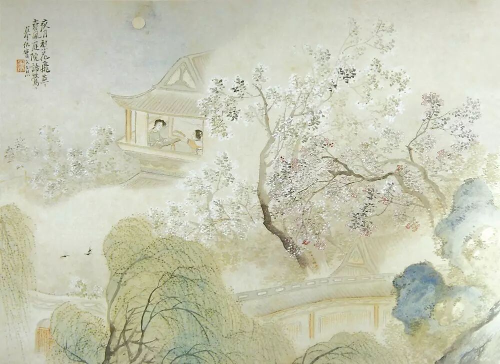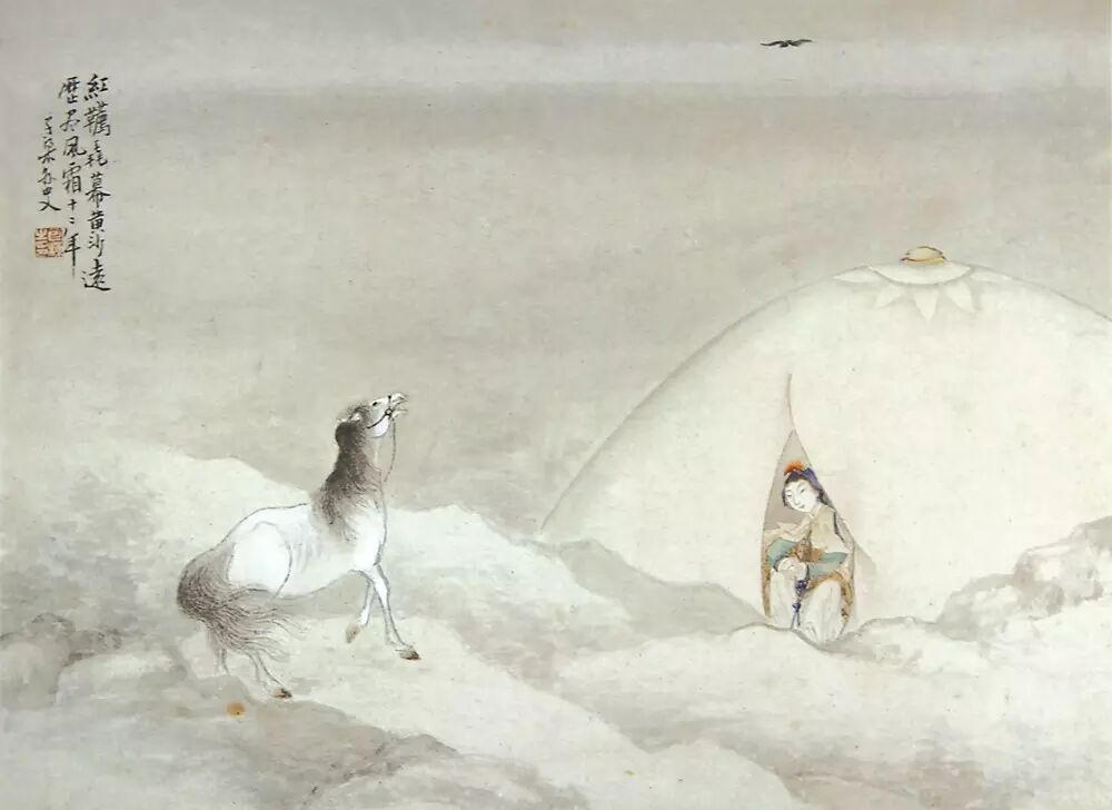 广西博物馆所藏的包栋《仕女图》册为纸本设色,共8开,每开纵28厘米、横38.5厘米。现选其中三开加以评析。图一绘两仕女在春夜月色下临窗细语的场景。画面中,一人抚琴,一人弹奏琵琶,气氛显得和谐融洽。窗外梨花繁盛,洁白的花瓣在月光下如白雪一般。两三只燕子在柳树间轻快地飞翔。画家在画面左上角题写:“夜月梨花飞燕燕,春风庭院语莺莺。摹仇实父意。”钤“子梁印子”朱文印。画家以轻灵、淡雅的笔调描绘出温婉恬静的景致,表现出姐妹间浓浓的情谊。从庭院的设计和人物的衣着、姿态可以看出,画家描绘的女子是深院中的大家闺秀。此作展现出的笔墨技法和画面意境符合题跋中的“摹仇实父意”之意。仇英的仕女画工细秀雅、含蓄蕴藉,色调淡雅清丽,融入了文人所崇尚的笔墨情趣。仇英的仕女画对后世影响极大,从包栋此图中就能看到仇英作品的影子。在图二中,画家同样描绘了两个仕女形象。画家在画面左上角自题:“菱叶菱花覆水萍,满溪都唱采菱声。红颜女儿摇小艇,却似菱花镜里行。宋人诗意。”钤“子梁”朱文印。画中仕女每人摇一叶小舟,泛于溪水之上。一女子俯身靠近溪水,伸手进水中采摘菱角。另一女子正划船而来,似要加入采菱角的活动中。河滩上柳树繁茂,河水中菱花点点,一行白鹭穿行在树林间,整个画面显得清新典雅。图三表现的是王昭君出塞的典故。画面中,王昭君坐于大漠中的蒙古包帐篷内,头顶有苍鹰在天空中盘旋,与她相伴的马儿仰天长啸,展现出一派凄凉之景。画家在图中题写:“红鞯毳幕黄沙远,历尽风霜十二年。子梁外史。”钤“包栋之印”白文印。与图一、图二相比,此图呈现出的意境更为开阔。画家通过动与静的对比,使画面彰显出苍茫之感。