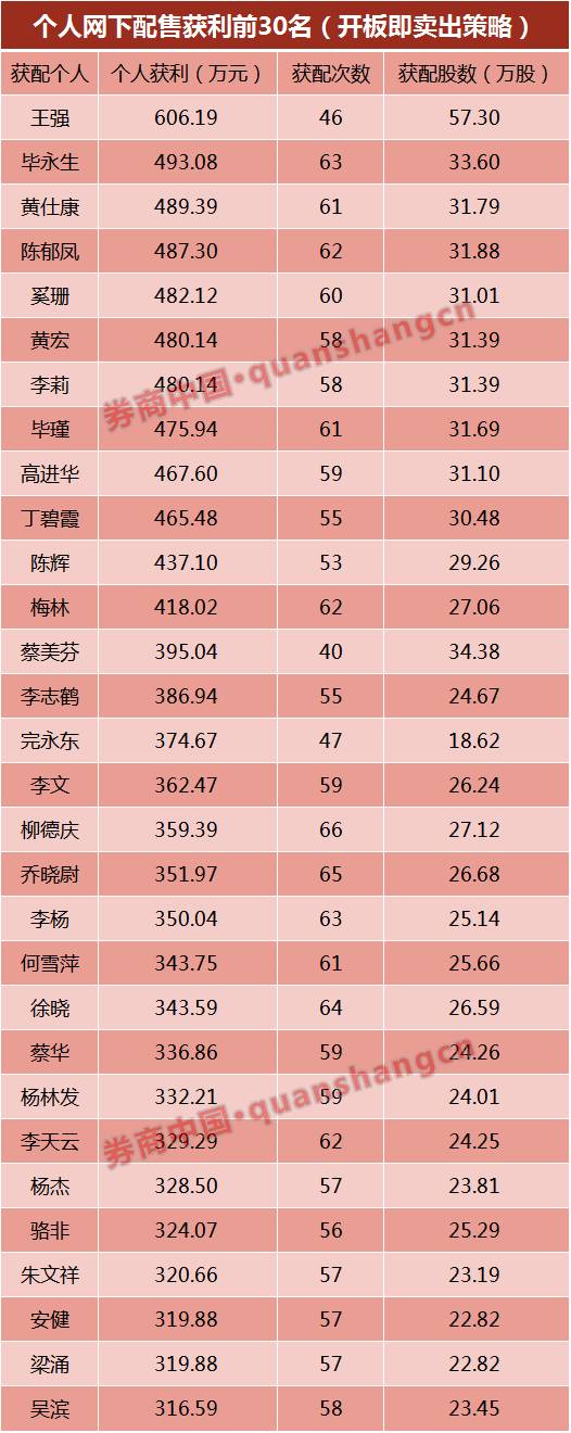 除此之外,毕永生、黄仕康、陈郁凤和奚珊的获利规模也较高,分别达到493.08万元、489.39万元、487.3万元和482.12万元,获配股数分别达到63只、61只、62只和60只。