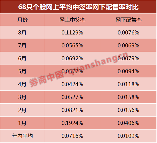 数据显示,今年以来共有68只新股进行了网下配售,平均配售率为万分之1.09(0.0109%),而8月份的网下配售率只有万分之0.76(0.0076%),低于今年平均水平。