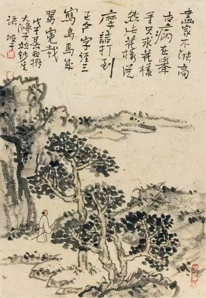 第一次读到石涛的画,是一九八二年在姜今先生的《中国画构图研究》的附图上,有两张石涛的山水画和一张梅花,山水一为《泼墨山水册之松下高士》,另一张是著名的《唐诗八开册之静夜思》。梅花呢,也是很著名的一张册页,上部一丛梅,下面一枝梅,中间题满字将上下连为一气,熟悉石涛的,应知我所说这张梅花为何图。