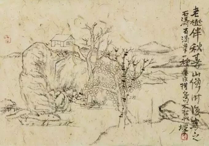 当时,我有空爱到一工厂美工老师的工作间玩,美工老师买画册图书可以公家报销,我到他那儿去,借口是向长辈讨教,心却是牵挂着那些画册,动机可谓不纯。有期《艺苑掇英》登有石涛《秋山图册》,或浓或淡或枯或湿的笔墨,点染赭石,俨然一片秋色,使我兴叹,叹秋容之动人,叹石涛手段之高妙。这张画,看后,便存于我心。前年夏,我终于临拟它一遍,算是偿了旧愿。