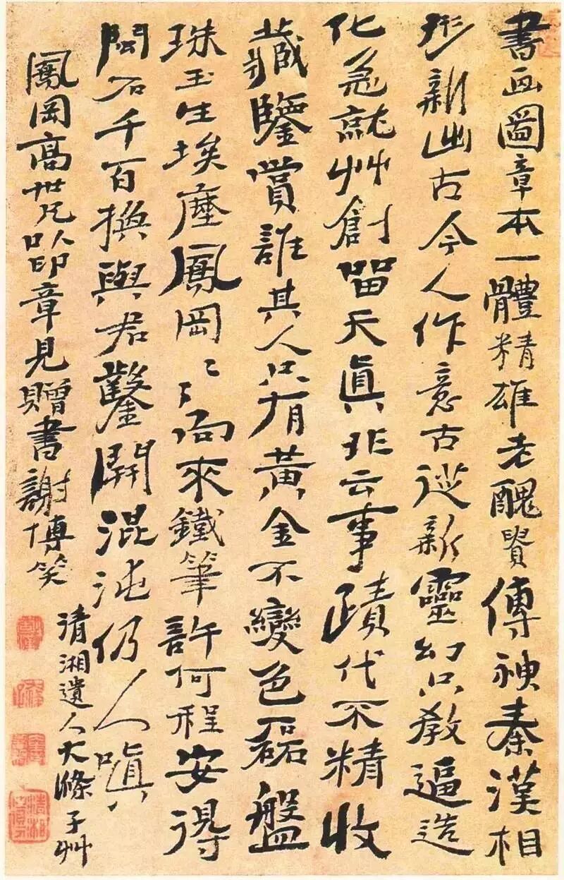 石涛于书,诸体皆工。善隶,彼时碑学不显,罕有汉碑现世,学隶体者,多不出唐宋元明圭臬,石涛亦然。然则石涛的隶书,洗去当时习气,古厚,生动,淋漓,合乎太古之意,盖由天授,非力运所能得之也。石涛小楷,出于钟、王,而受倪瓒影响尤深,清丽,古秀,雅健,如小杜之诗。石涛的行书,豪宕遒婉,沉着痛快,或浓,或淡,或干,或湿,皆能热烈、生动而鲜活,有如其画,尤可赞者,字中每每出现一、二涨湮之墨,恰与画中墨团唱和,使画面更有节律,整体感更强。