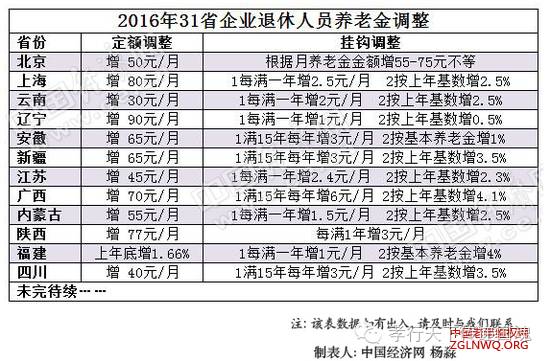 近日,随着江苏、安徽、广西省退休人员基本养老金调整方案出台,中国经济网记者统计了31个省市养老金调整情况,据不完全统计,目前至少有12个省份公布上调养老金,同时又很多地区的养老金总体水平超过6.5%。