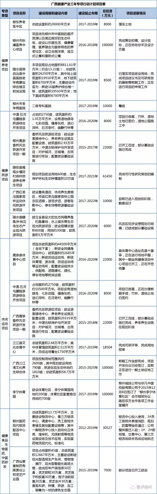 广西日前印发了《广西健康产业三年专项行动计划(2017—2019年)》,涵盖健康养老、健康旅游、健康休闲运动等6大健康产业的388个项目被列入专项行动中,总投资2124.64亿元,其中柳州占据17个项目。