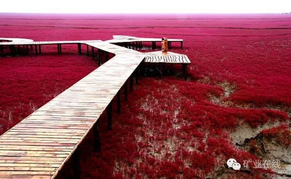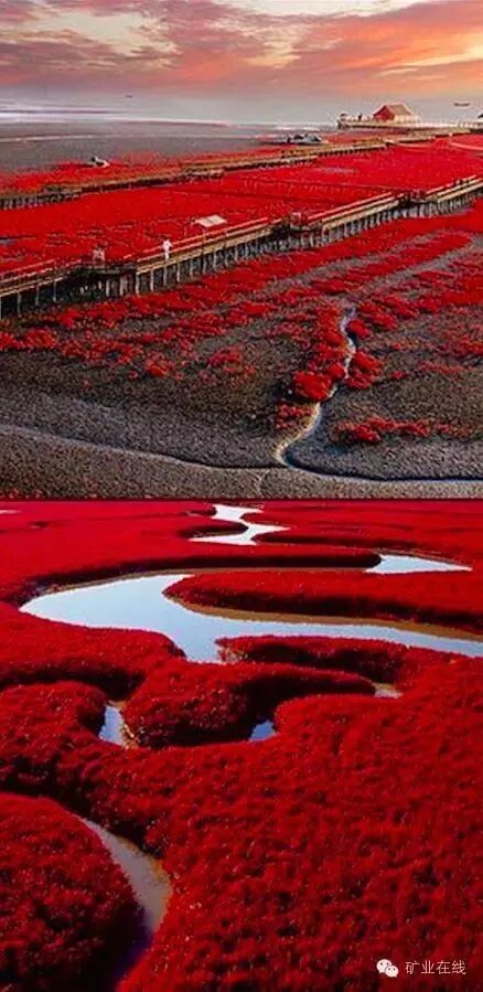那就是中国辽宁的盘锦红海滩。盘锦的红海滩是大自然孕育的一道奇观。海的涤荡与滩的积沉,是盘锦红海滩得以存在的前提;碱的渗透与盐的浸润,是红海滩得以红似朝霞的条件。这些红色是一种叫碱蓬草的植物,是惟一一种可以在盐碱土质上存活的草。红海滩风景区位于辽宁省盘锦市大洼县赵圈河镇境内,在这里你会看到这样的美景: