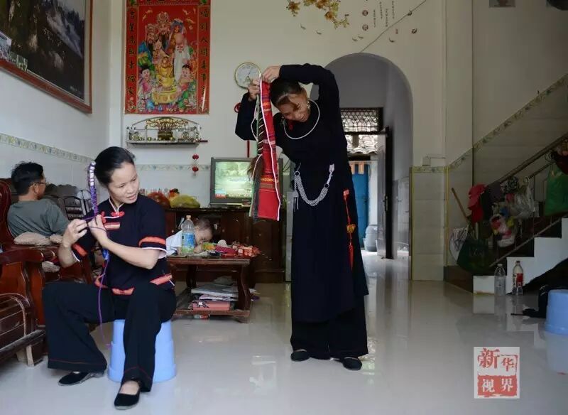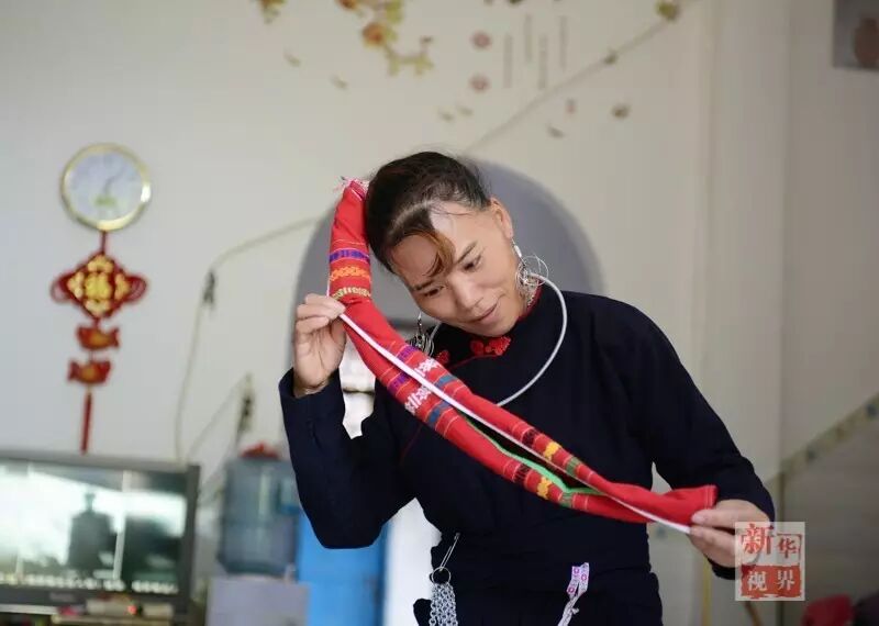 在这里,凡有红白喜事,要弹奏天琴。特别是一些年轻女子,更是喜爱弹奏“天琴”来表达心底暗藏的情愫。△村民廖丽芳在梳妆,为天琴弹唱练习做准备。