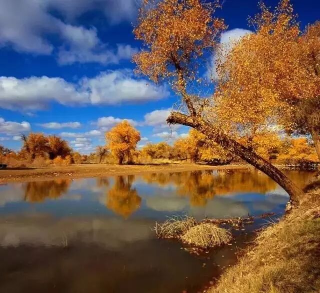 晴空万里蓝镶白,胡杨浸秋入人怀,黄叶翻飞着画境,柔情若水不思归。这就是额济纳的秋天。