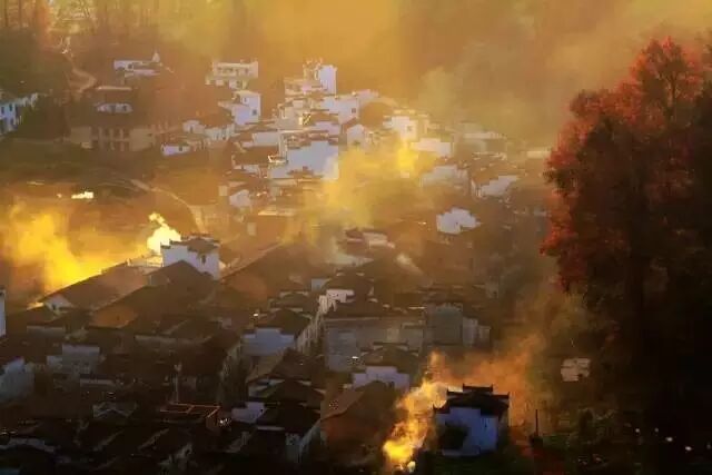 白霭中的村庄充满了徽派建筑的古朴之感,四周环绕的树木高高低低,绵绵的红叶给这幅静默的山水画添上了火热的色彩。