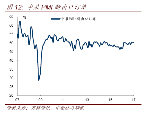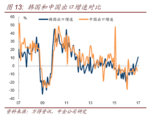 全球的经济复苏也带动全球的贸易需求改善。从中国公布的1月份PMI数据的新出口订单上升也可以看到这一点(图12)。贸易数据公布更为领先的韩国,其1月份出口增速回升到11.2%,创2012年2月份以来的新高,也某种程度反映了全球的贸易回升。鉴于韩国出口增速与中国出口增速在大的趋势上有较强的相关性,我们预计中国1月份出口增速也会有较明显的回升(图13),出口增速可能从12月份的-6.2%回升至5%-10%的正值水平,也会创近2-3年的新高(当然这种回升有部分是源于低基数影响)。也正因于全球经济景气程度回升,我们在1月份中采PMI数据点评中也分析过,中短期内,中国经济的压力更多源于内部而不是外部。