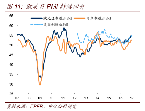 相比于中国中采和财新PMI小幅回落,欧美日等发达经济体的PMI则强劲得多(图11)。在2月1日公布的Markit PMI数据中,欧元区制造业PMI回升至55.2,创2011年以来新高,日本制造业PMI回升至52.7,创2014年4月份以来新高,美国制造业PMI上升至55.1,为2015年3月份以来最高。而美国本土的ISM制造业也是创2014年11月份以来新高。作为经济的晴雨指标,全球PMI回升至近几年高位显示全球经济景气程度持续回升,这背后源于美国经济刺激方案带来的信心提振、全球货币政策宽松的支持以及全球大宗商品价格回升带来的制造业复苏。